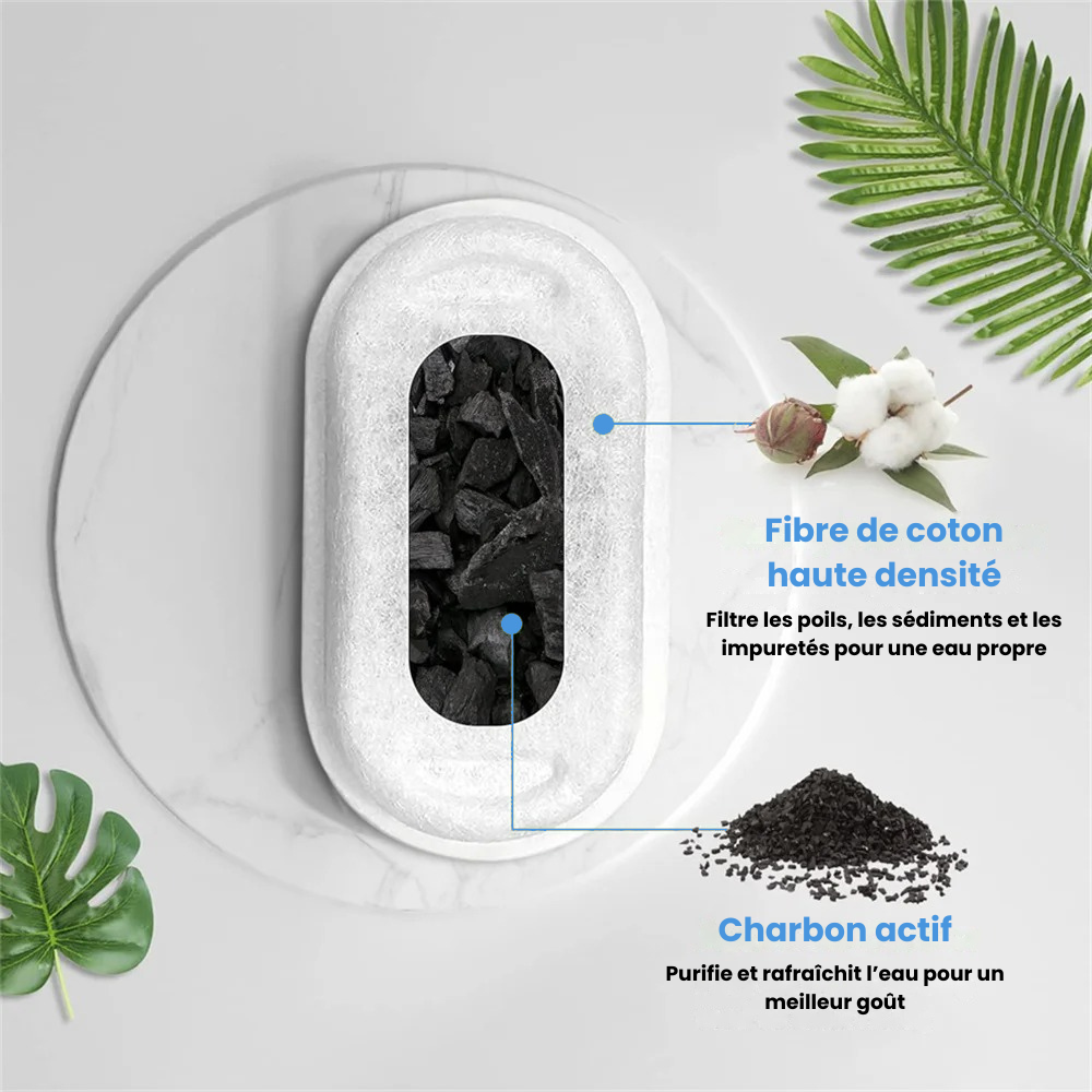 Les filtres à charbon (filtres blancs) sont à changer toutes les 4 semaines. Le filtre en mousse (filtre noir) est à changer tous les 2 mois. La fréquence de changement peut varier en fonction de l'utilisation de la fontaine.